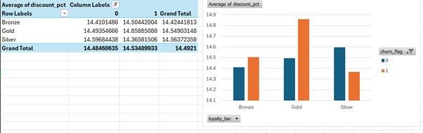 1. Inefektivitas Insentif Tier: Perbedaan rata-rata diskon antara pelanggan yang churn dan yang loyal sangat tipis di semua level membership. Bahkan pada tier tertentu, diskon untuk pelanggan yang churn justru lebih besar. Ini mematahkan asumsi bahwa “semakin tinggi tier/diskon, semakin loyal pelanggan”. Dengan kata lain, status membership dan besaran diskon terbukti bukan faktor penentu utama untuk mencegah pelanggan pergi. Pelanggan tidak hanya melihat ”Perang Harga” sebagai acuan dalam menentukan pembelian terhadap produk yang dinimati (Semakin murah suatu harga, maka semakin besar loyalitas pelanggan tersebut untuk tetap stay di toko tersebut). Maka, pemimpin perlu menggunakan pendekatan lain untuk menjaga hubungan pada pelanggan dan memastikan kualitas layanan produk unggul dari kompetitor lainnya yang tidak hanya terfokus pada harga.