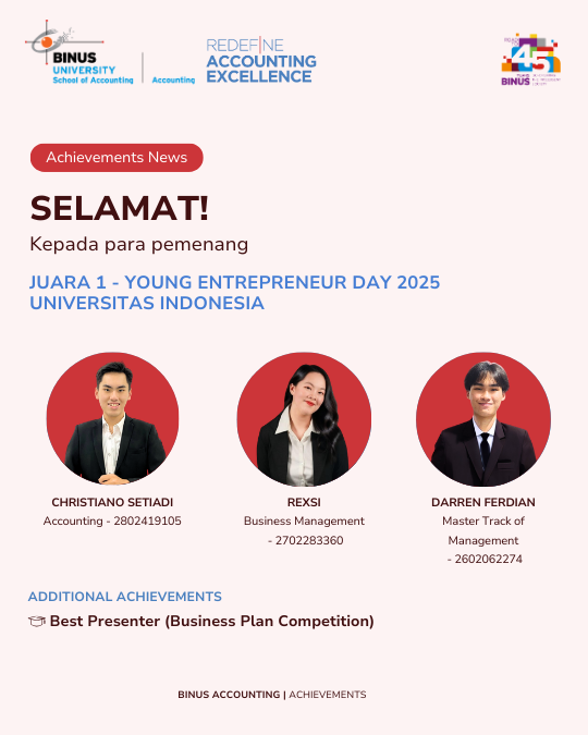 Prestasi ini diraih oleh Christiano Setiadi (Accounting), Rexsi (Business Management), dan Darren Ferdian (Master Track of Management). Kolaborasi ini menjadi bukti bahwa kerja sama antarbidang dapat menghasilkan capaian yang membanggakan dan berdampak π
